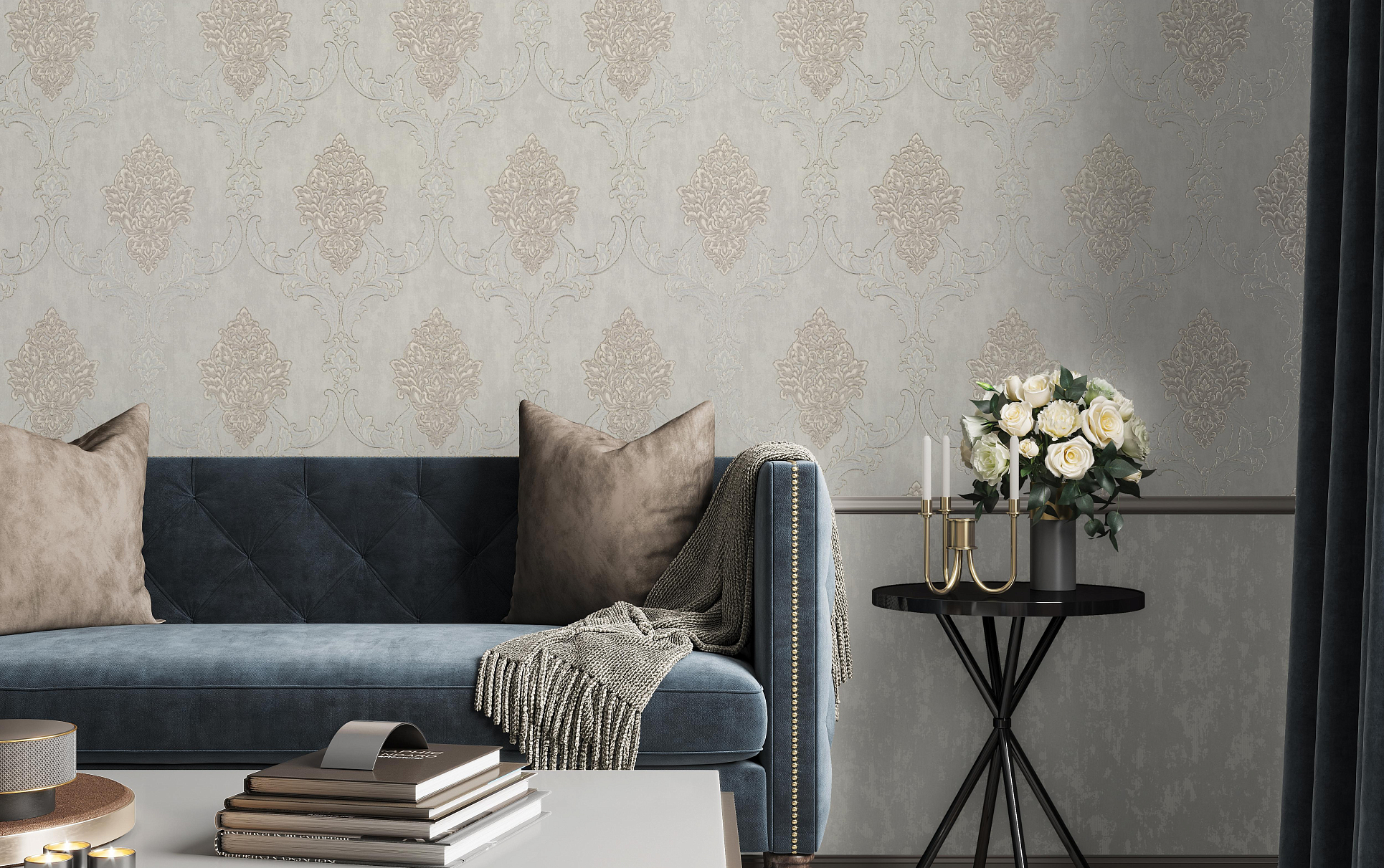 Роскошная фактура сочетает гладкость и шелковистый блеск ткани с декоративностью штукатурки. Плотный рельеф отлично скрывает неровности стен.