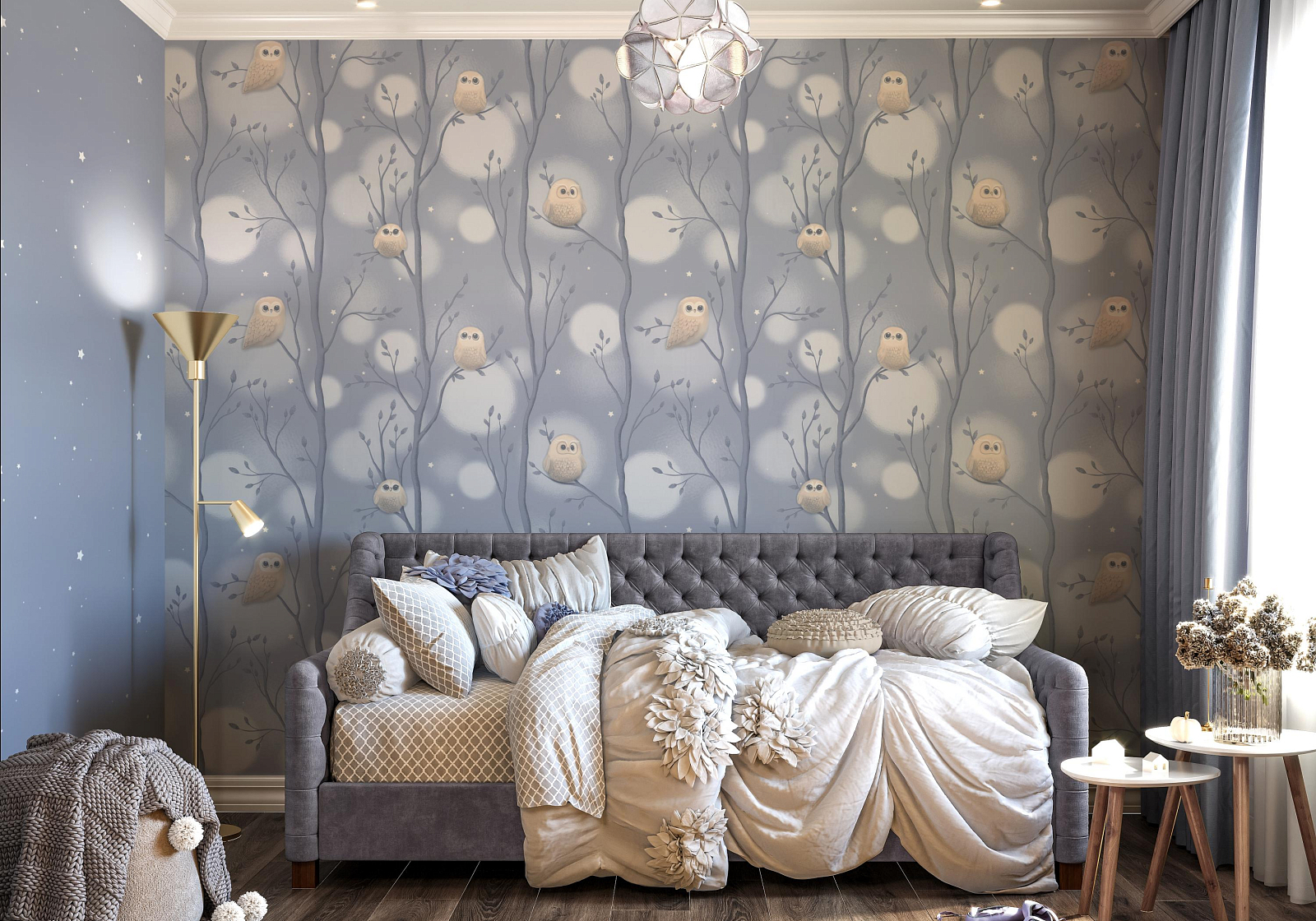 Пушистые воздушные шары-светлячки, которые мягко выплывают из туманной дымки, обволакивают пространство уютом. Они гармонично переплетаются с плавными ветвями деревьев и маленькими мультяшными совушками, образуя многоплановый рисунок.