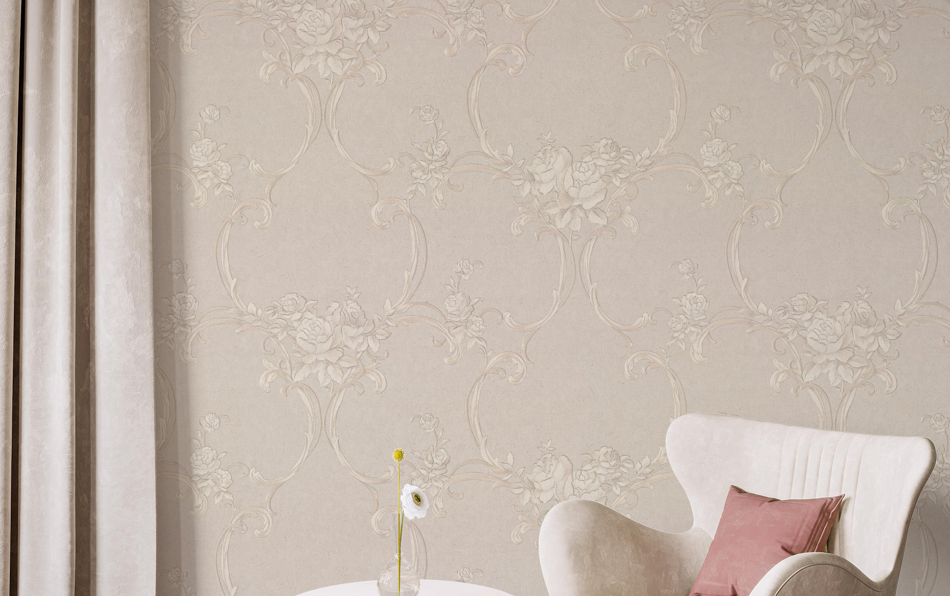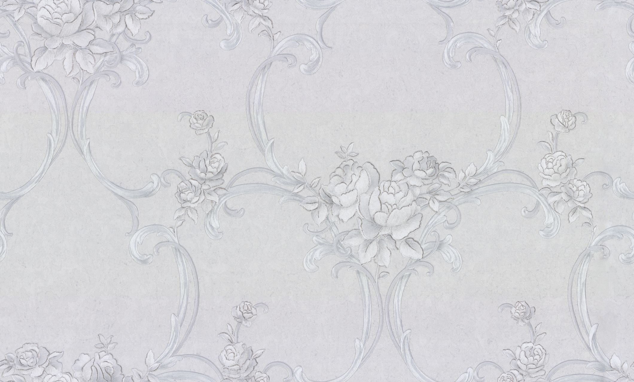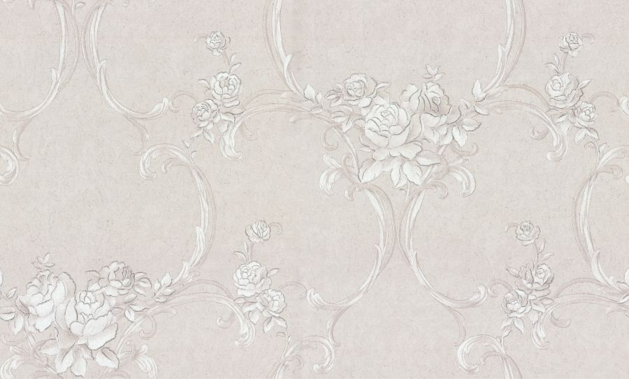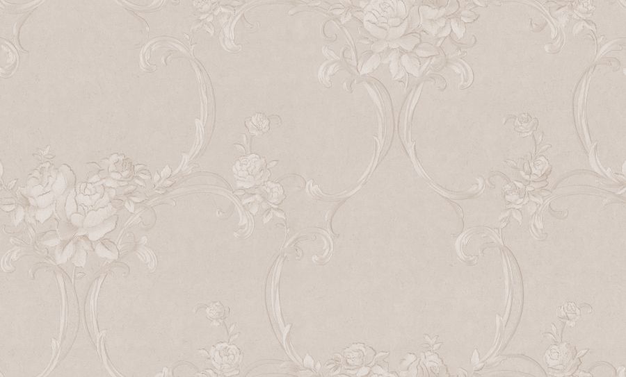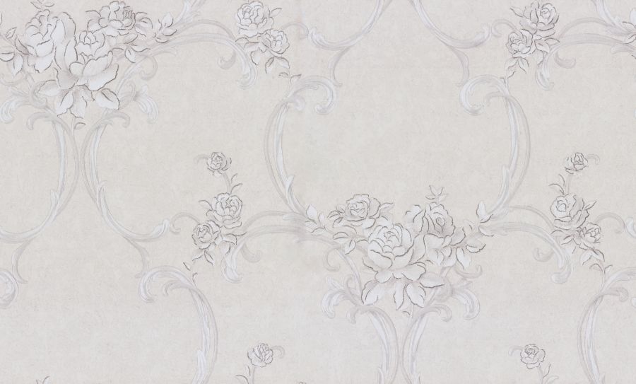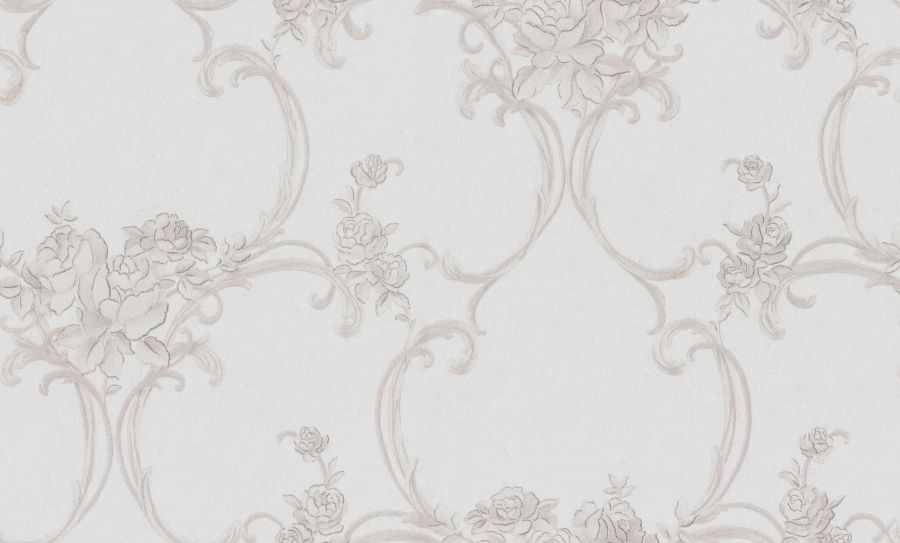 Цветочные обои Terra с мотивом из переплетенных вензелей и нежных букетов выполнены в монохромной гамме. Изящно сочетаясь с фоном, они переливаются на свету под разными углами.