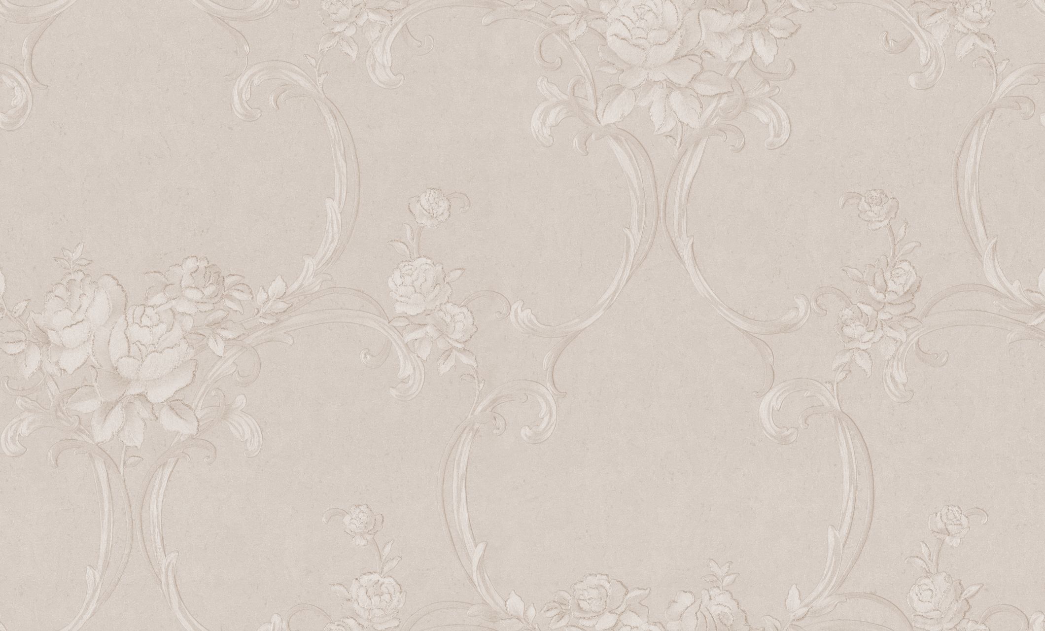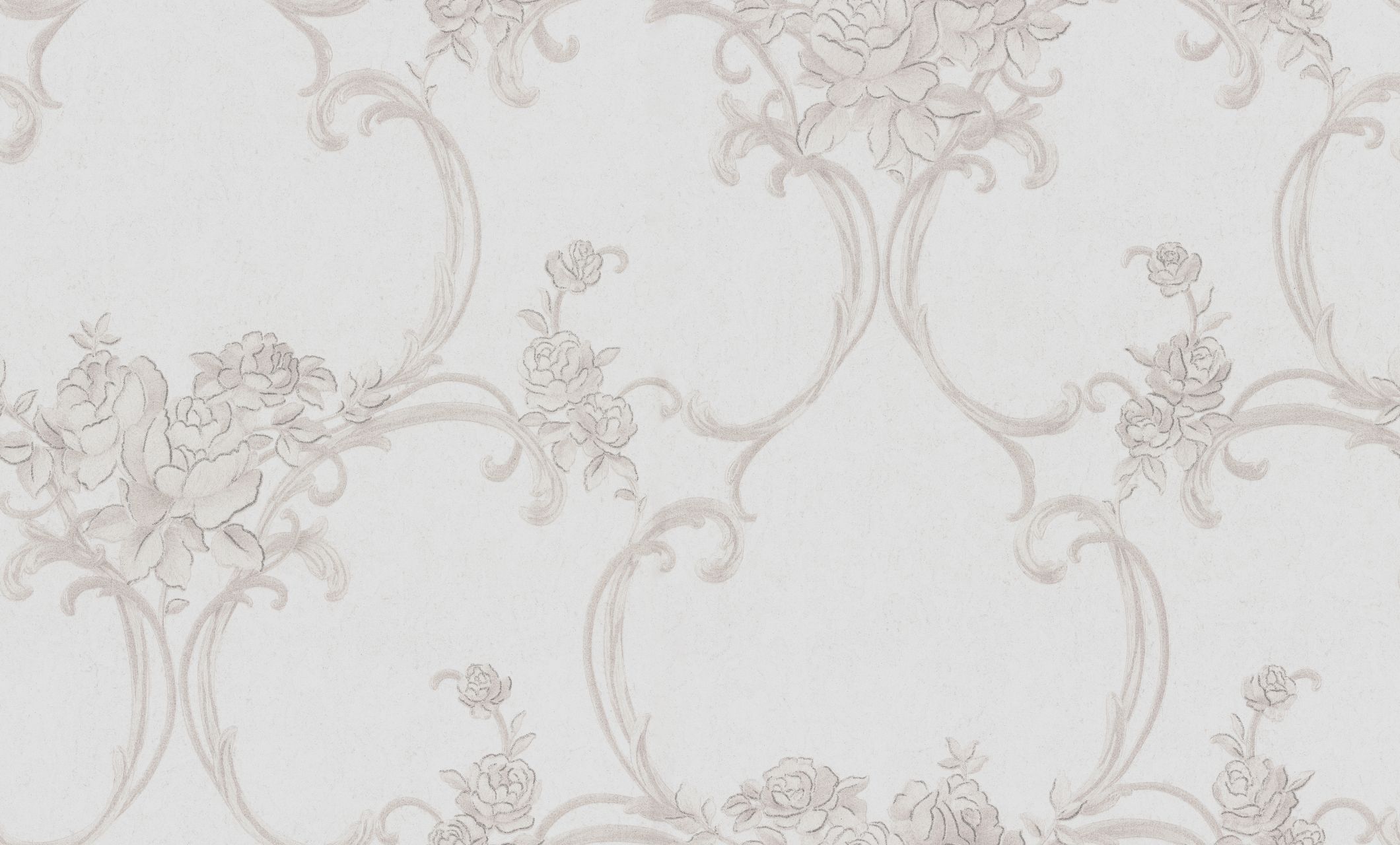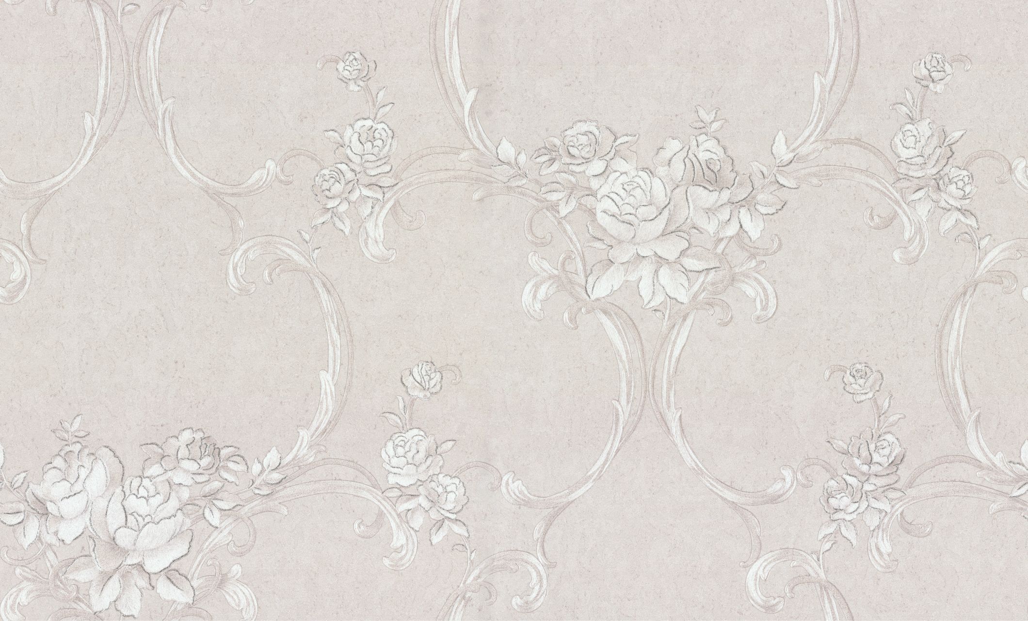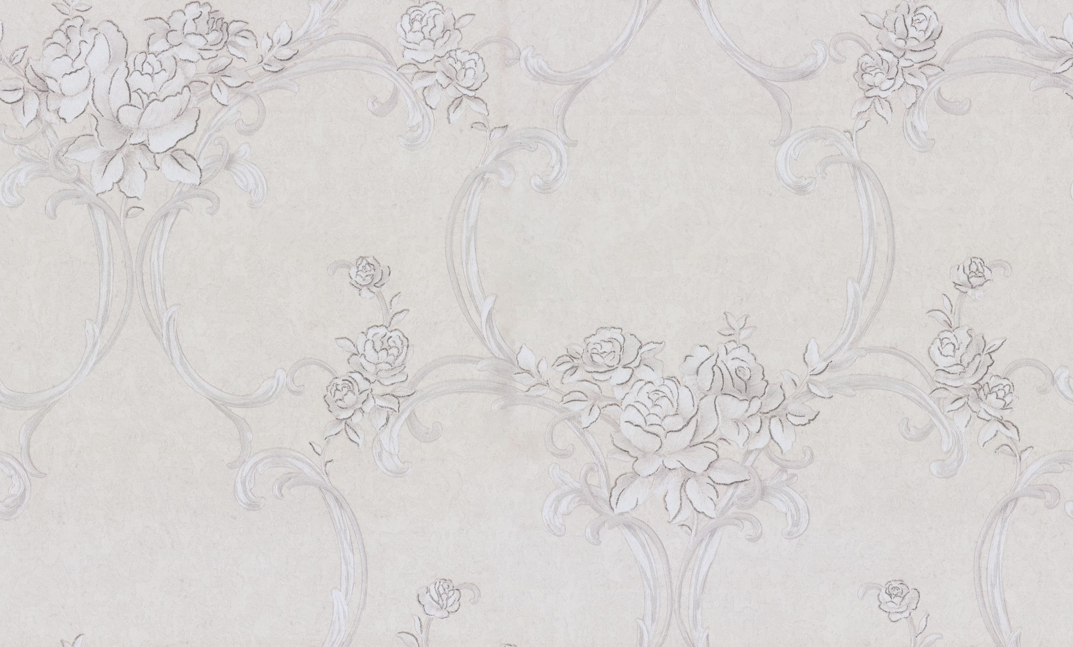 Цветочные обои Terra с мотивом из переплетенных вензелей и нежных букетов выполнены в монохромной гамме. Изящно сочетаясь с фоном, они переливаются на свету под разными углами.