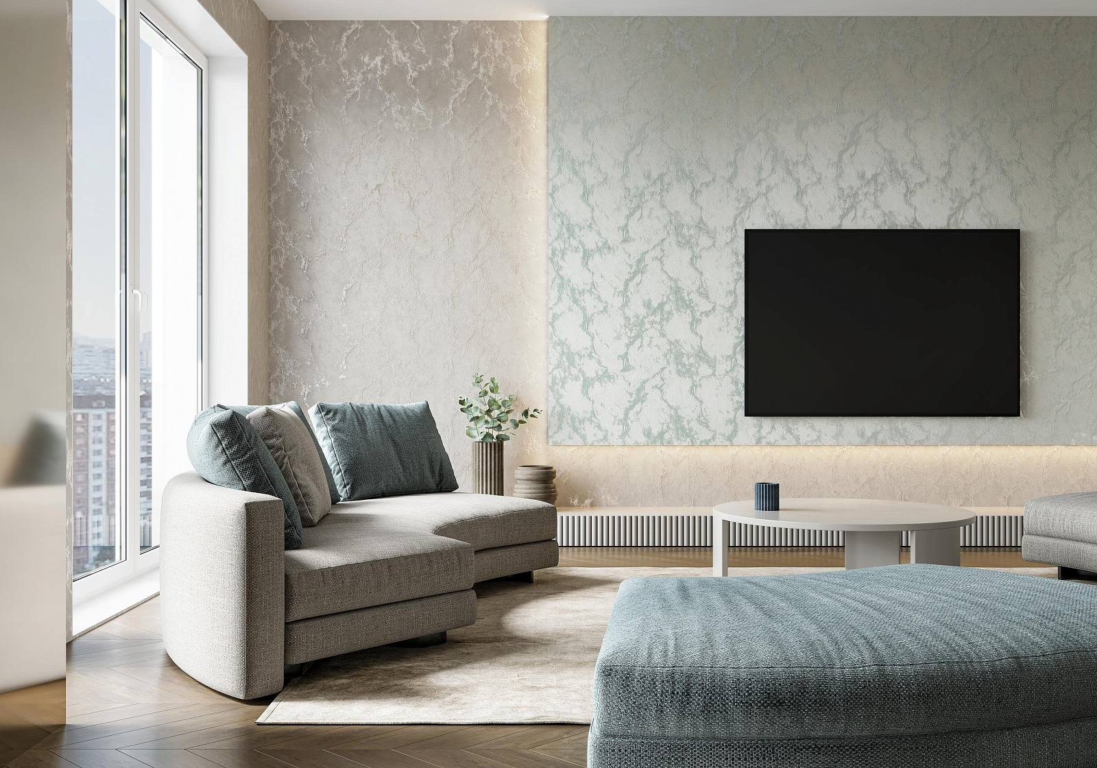 В коллекции преобладает универсальная светлая палитра мрамора – от перламутрового и жемчужного до светло-бирюзового – спокойные оттенки визуально расширяют комнату, хорошо сочетаясь с классической мебелью и лофтовыми интерьерами.