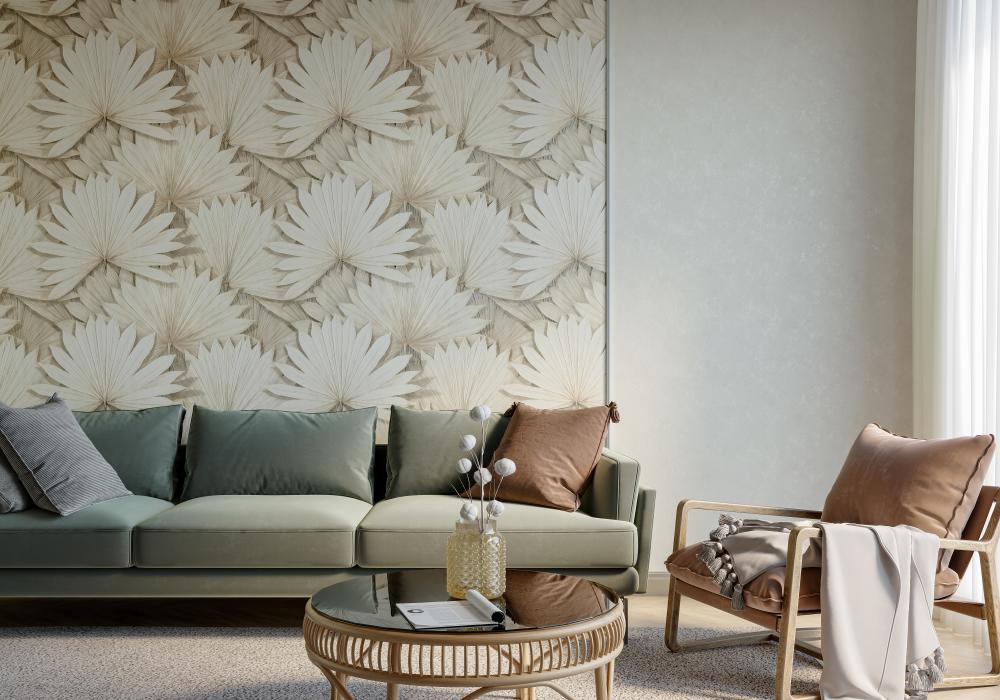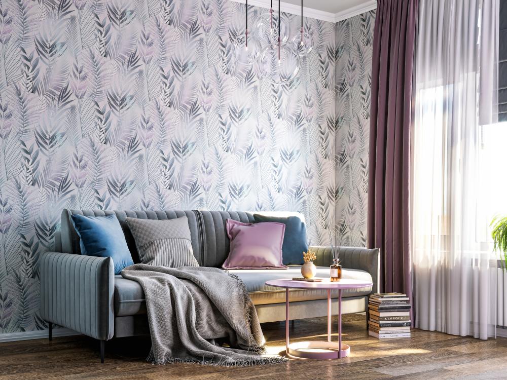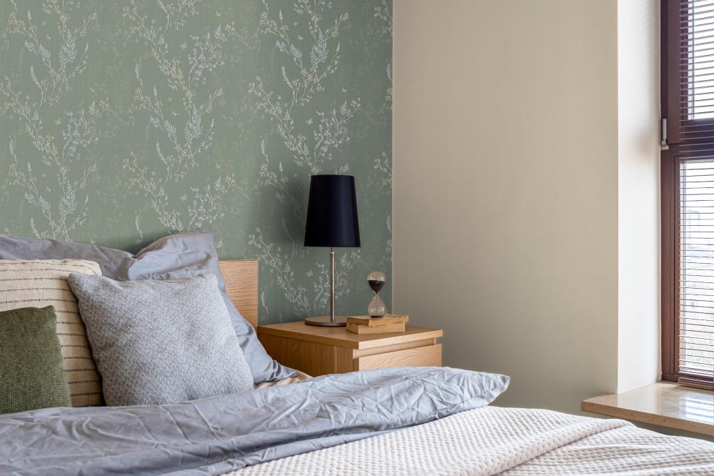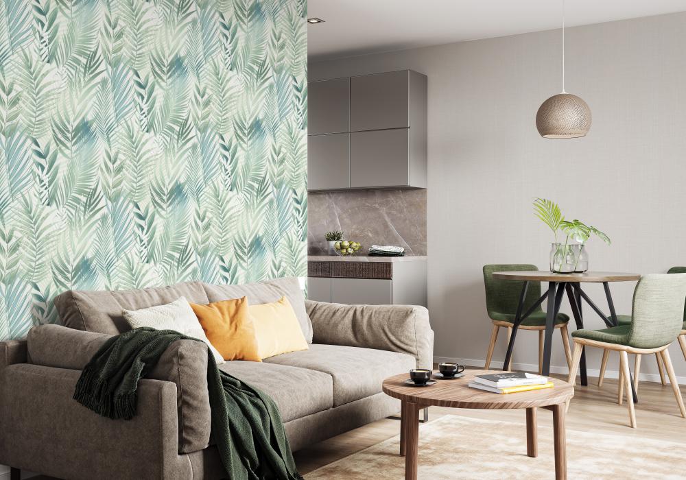 Малахитовый, мятный, горчичный, травяной, фисташковый, изумрудный и другие оттенки зеленого означают обновление и прилив свежей энергии. Они могут иметь различные узоры и рисунки, например, листья деревьев, цветы, ветки. Такие обои используются в разных комнатах – от спальни до кабинета или гостиной.